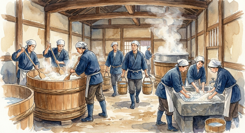 蔵人とは、杜氏以外で酒造りの現場に立つ職人たちを指します。冬季または通年で仕込み作業に携わり、実際の酒造工程を担う存在です。