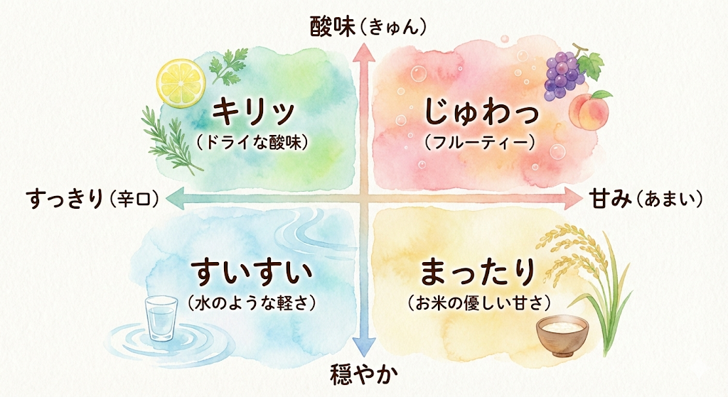 難しい専門用語やスペックを覚える必要は、もうありません。 あなたが持っている「口当たり(オノマトペ)」の感覚だけで、日本酒はたった4つのタイプに分けられます。