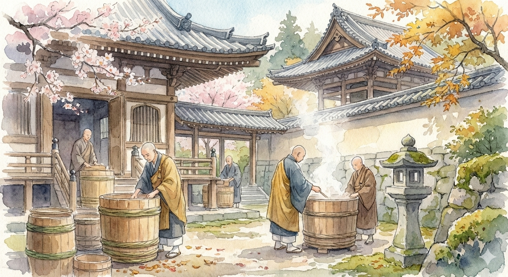 宗教施設である寺院は、安定した人員と知識の蓄積が可能だった点で、酒造りに適した環境だったとされています。