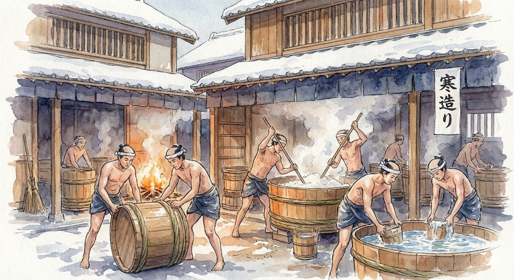 江戸時代に入ると、冬季に酒を仕込む寒造りが一般化します。低温環境では雑菌の繁殖が抑えられ、発酵を安定させやすいためです。
