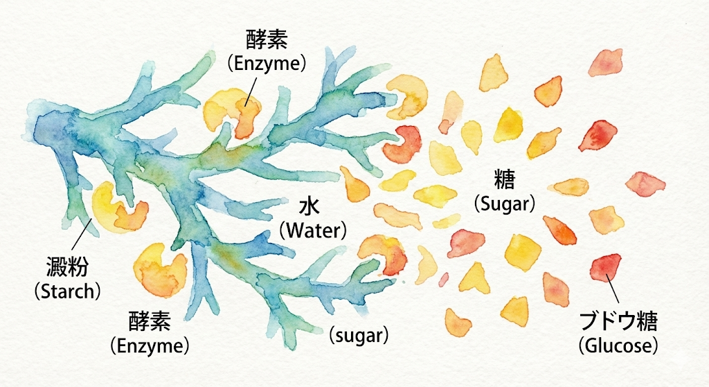 米はそのままでは酵母が利用できないため、麹菌が生成する酵素(アミラーゼなど)によって糖化されます。この糖が、後に酵母によってアルコールへと変えられます。